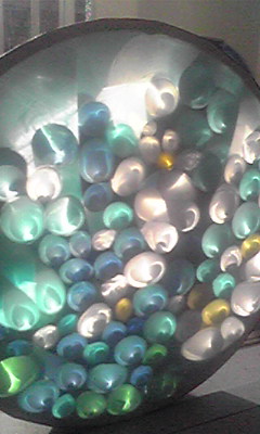 丸い太鼓のような物の中に「海」をイメージしてブルー系の光る用紙・・・名前がわからない・・・を丸めて入れた